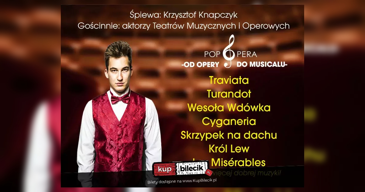 Zapraszamy na niepowtarzalne widowisko muzyczne, które przeniesie Cię w podróż od klasycznej opery po ekscytujące hity musicalowe! Najpiękniejsze arie operowe świata oraz największe przeboje z polskich i amerykańskich musicali wykonane na żywo przez starannie wyselekcjonowanych muzyków pod przewodnictwem dr Bogny Dulińskiej. Ponadczasowe melodie zaśpiewają wybitni soliści Teatrów Muzycznych i Operowych, m.in. Krzysztof Knapczyk, których brawurowe wykonania zdobyły uznanie publiczności na całym świecie. Koncert "Pop Opera - Od Opery do Musicalu" to nie tylko muzyka, to także wspaniała oprawa wizualna i taneczna, którą wzbogacą nasi artyści.