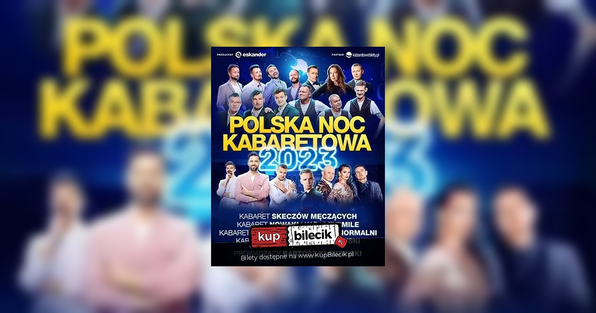 Polska Noc Kabaretowa 2023. Superprodukcja roku. Same premiery. W tym roku przyświeca nam jedna zasada: 0 cenzury - 100% kultury. Nie będzie tematów tabu. Nieskrępowana swoboda artystów zaowocuje tematami ostrymi i kontrowersyjnymi. A wszystko w atmosferze wzajemnego szacunku i pełnej kultury. Myślisz, że o rozrywce wiesz wszystko? Polska Noc Kabaretowa zabierze Cię w zupełnie nowy wymiar zabawy. Swoje siły połączyły najwybitniejsze kabaretowe zespoły i stworzyły widowisko doskonałe. Kabaret Ani Mru Mru - po raz pierwszy w Polska Noc Kabaretowa, Kabaret Nowaki, Kabaret Skeczów Męczących, Kabaret Paranienormalni, Kabaret K2, Szymon Łątkowski, Kabaret Smile poprowadzeni przez niezrównanego Bartosza Klauzinskiego. Na jednej scenie największe gwiazdy kabaretowego Hollywood w premierowej odsłonie najlepszego humoru!